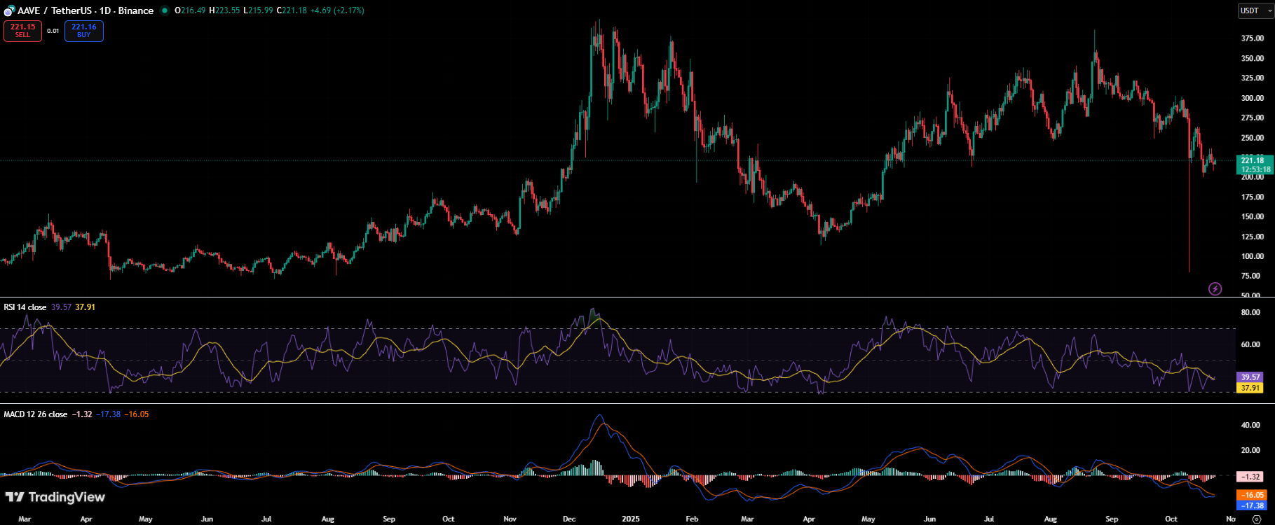 AAVE现报221美元,似乎已在210美元关键心理位上方企稳。RSI徘徊在38附近,MACD动量在数月下行后趋于平缓,这种技术形态往往预示着修复性反弹。除技术面外,Aave在以太坊及其Layer2网络Arbitrum和Base上的流动性市场重现活力,机构对链上借贷的兴趣增长正推动其生态扩张。