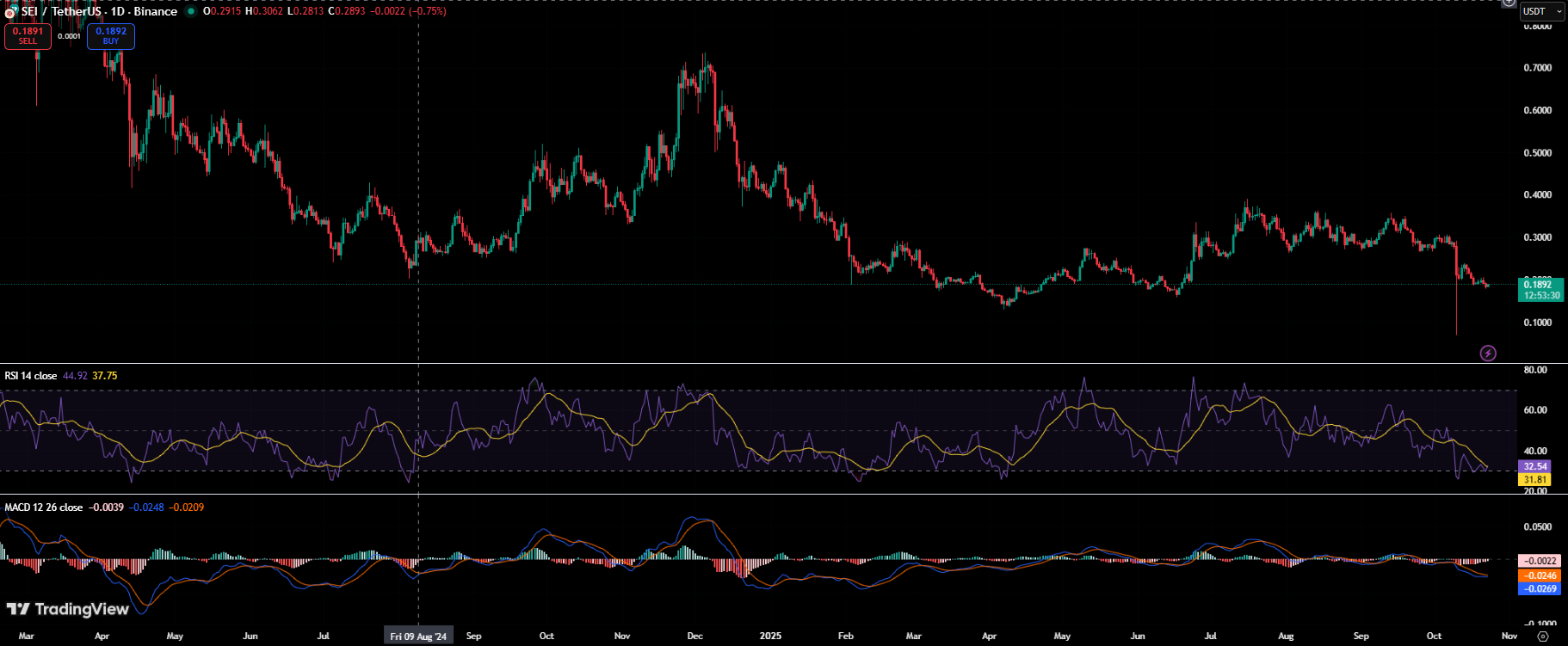 专为高速交易和去中心化交易所优化的Layer1区块链Sei近期遭遇猛烈抛售,代币价格跌至0.18美元附近。但技术指标显示下跌动能或已接近衰竭:RSI跌破32进入超卖区间,TD Sequential发出买入信号,MACD柱状图出现向信号线收敛迹象。