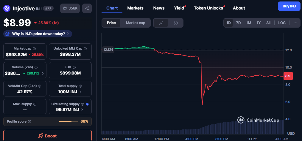 根据CoinMarketCap数据,Injective(INJ)在过去24小时内经历剧烈下跌,跌幅达25.89%至8.99美元。该代币从约12.12美元位置滑落,显示市场存在强劲抛售压力。