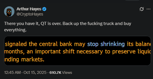 TD Cowen分析师持相同观点,认为10月10日市场暴跌后比特币的韧性将成为主要推动力。他们预测$BTC可能在12月触及14.1万美元,刷新历史新高。宏观环境同样支持这一判断——在鲍威尔暗示将结束银行业量化紧缩(QT)后,Arthur Hayes明确发出了"全面买入"信号。