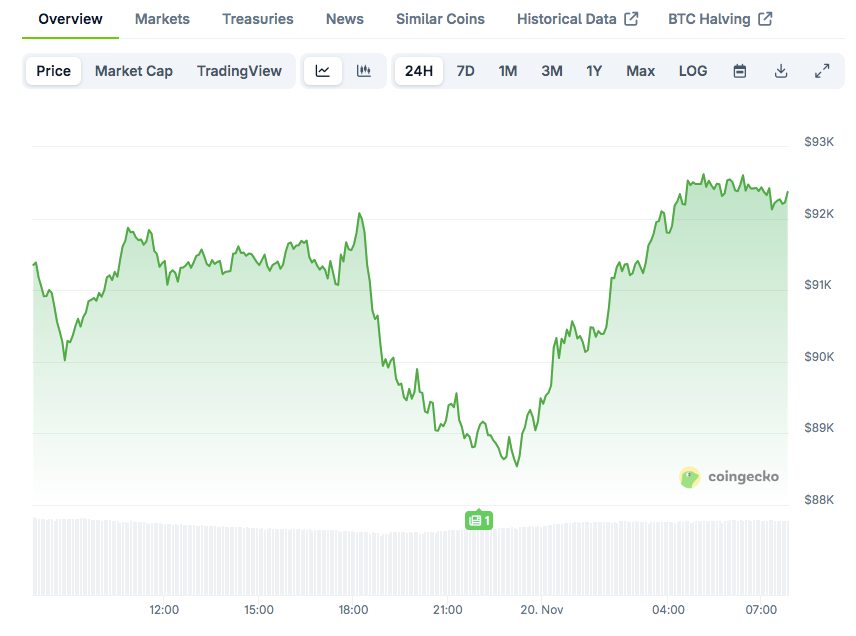 根据CoinGecko数据,比特币现报92,749美元。过去24小时上涨1.88%,但周线仍下跌9.44%。