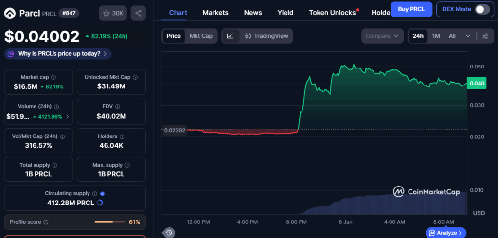 在此公告发布后,Parcl代币经历了近100%的显著涨幅。随后部分涨幅回落,目前该代币交易价格为0.04002美元,仍保持约80%的涨幅,交易活跃度同步上升,24小时交易量增长超过4100%。