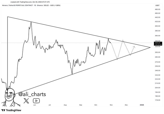 门罗币持续形成的对称三角形结构,通常预示着市场即将出现决定性变动。这种形态显示支撑位与阻力位逐渐收窄,形成买卖双方的博弈态势。分析师Ali(@ali_charts)指出,当价格突破任一边界后,XMR可能迎来50%的波动空间。