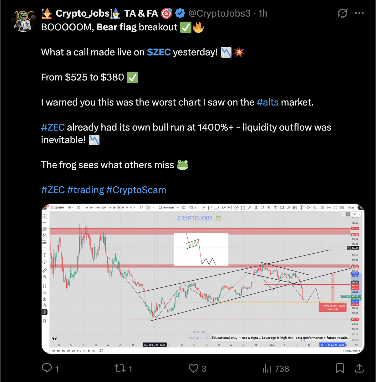 支撑区间的跌破大幅提高了ZEC在未来几周跌向通道下轨(约200-250美元区域)的可能性。