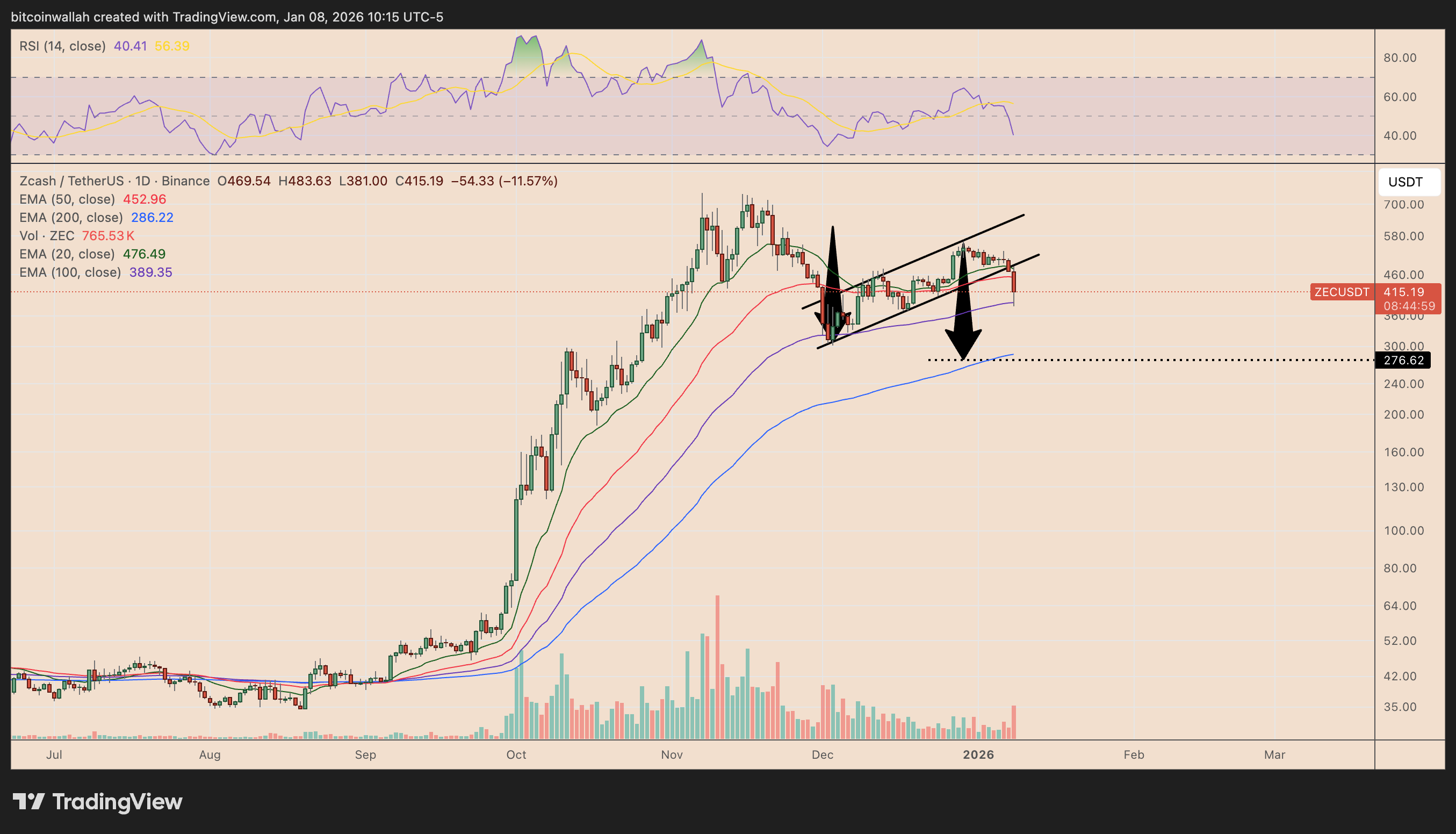 图表技术分析显示ZEC下一回调目标位于200-300美元区间;ECC内部不确定性使反弹行情易受卖压冲击。