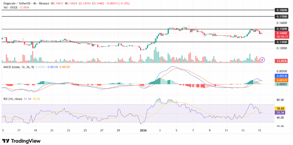 尽管存在积极信号,狗狗币近期价格走势略显平淡。DOGE曾尝试突破0.1500美元未果,目前进入盘整阶段,价格稳定在0.1437美元附近。MACD指标显示死叉形态,即MACD线略低于信号线。同时,相对强弱指数(RSI)处于51水平,表明市场买卖力量相对平衡。