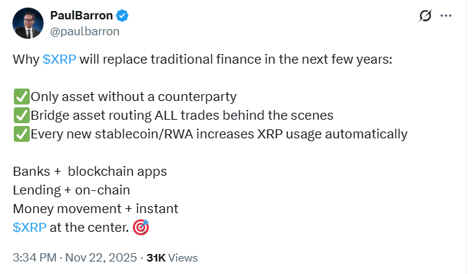 XRP支持者反复强调,该代币具有无交易对手方特性,能在不同系统间发挥桥梁作用。