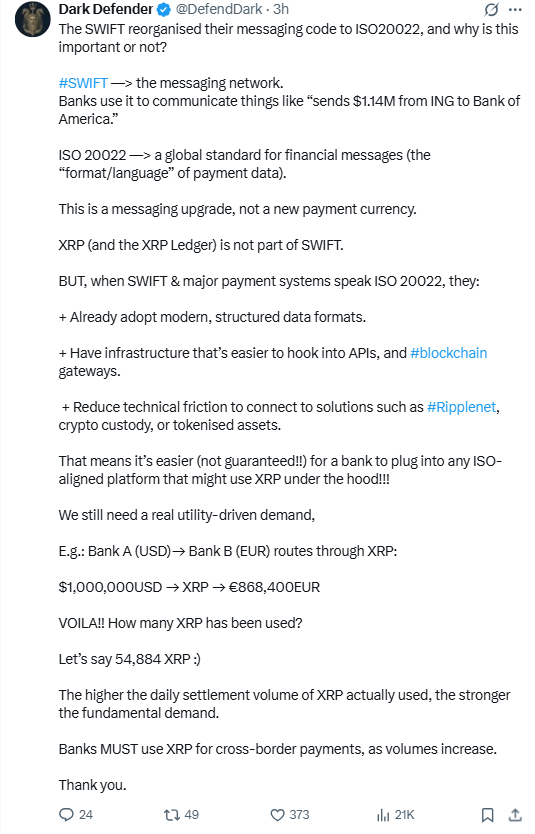 更广泛的讨论显示,ISO 20022可能降低数字资产系统的应用门槛。但仅靠标准升级并不足以创造代币需求,银行仍需更具说服力的理由才会选择使用XRP进行价值结算。