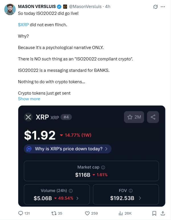 XRP价格与ISO 20022关联性分析 | 来源:MASON VERSLUIS