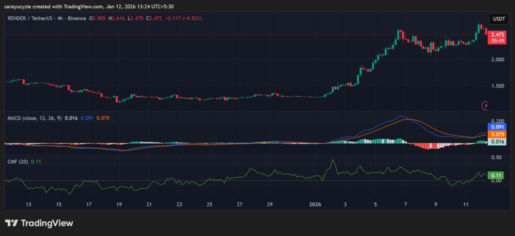移动平均收敛 divergence(MACD)线稳居信号线上方,显示看涨动能。当前趋势较为强劲,价格或延续上行态势。柴金资金流量(CMF)指标位于0.11,暗示RENDER市场存在温和买压。同时资金流入强于流出,表明正处于健康积累阶段。