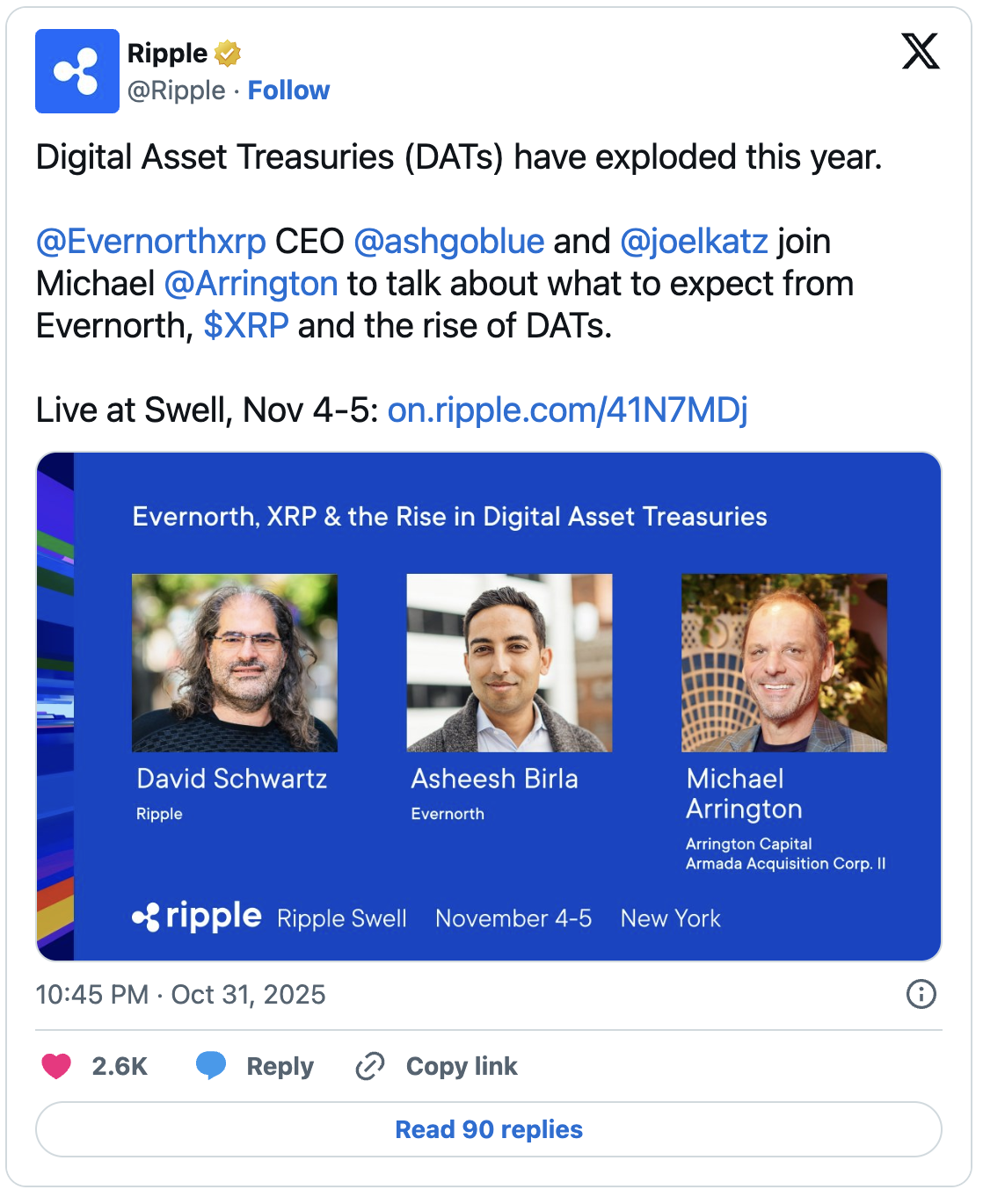 10月成为重要里程碑——Evernorth通过与Armada Acquisition Corp II合并正式进入市场,合并后新成立的实体以10亿美元总营收为目标,成为全球最大公开持有XRP储备的机构。自10月30日起,Evernorth以股票代码"XRPN"在纳斯达克交易所开始交易。该公司首席执行官Asheesh Birla强调,此举将为数字资产领域注入企业级信任。