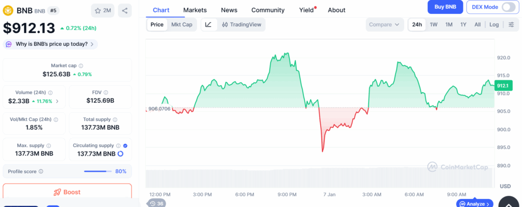 主网硬分叉升级对BNB价格产生了轻微的积极影响。过去24小时内,BNB仅上涨0.72%,交易价格为912.13美元。尽管如此,其周涨幅仍达5.75%,年涨幅高达24.79%。