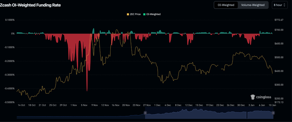 ZEC于11月触及近770美元高点后持续走低。尽管其间出现数次短期资金费率正值峰值,但均迅速逆转。正如一位市场观察者指出:“我们可尝试在支撑位交易,但波动幅度及后续动向难以预估。”