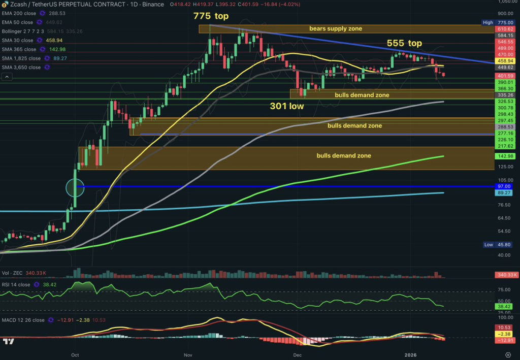 在更高时间框架上,双顶形态已初步形成。首峰位于775美元附近,次峰接近555美元。颈线位于301美元附近,此为去年11月低点。若跌破该水平,可能推动ZEC进一步深跌。