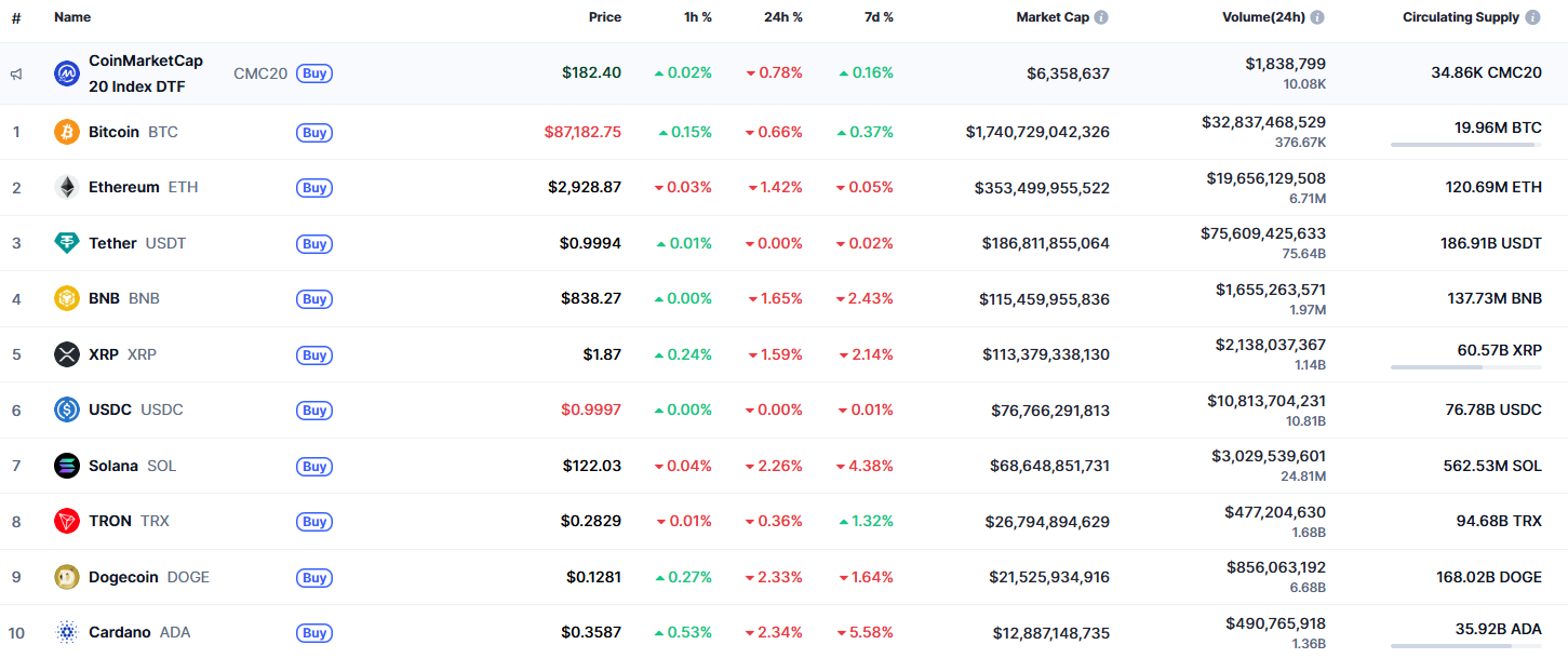 根据CoinMarketCap的数据,本周中期市场呈现下跌态势。