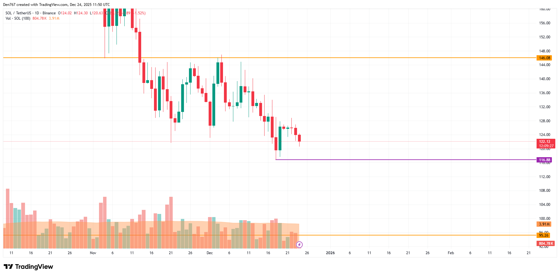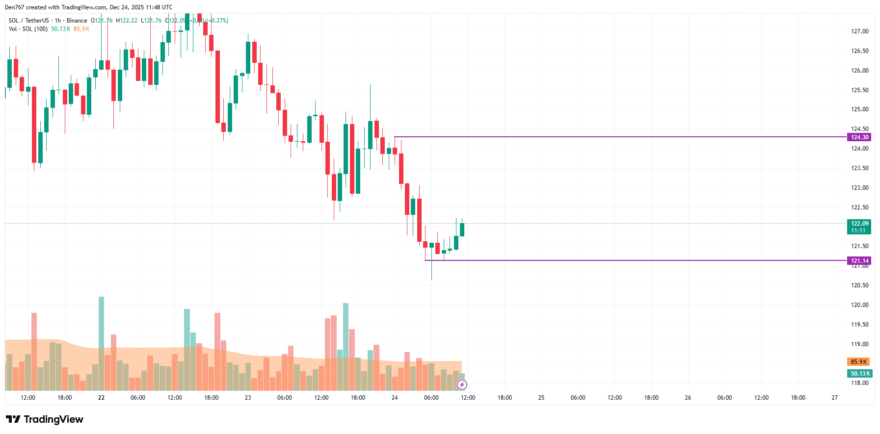 从小时线图来看,SOL价格未能有效突破121.14美元的本土支撑位。若日线收盘价远离该位置,预计很快将测试124美元区间。