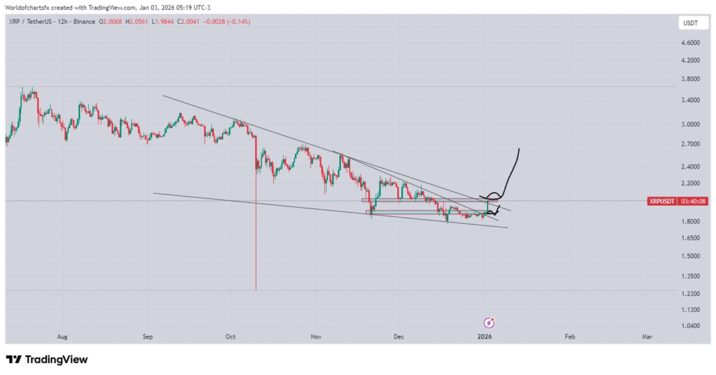 分析师指出需要重点关注两个关键位置:其一是水平支撑位的回测确认,若价格触及该区域后反弹,可能构成买入信号;其二是对下降趋势线的突破,这或预示上涨趋势的开启。这两个关键区域将成为判断XRP后续走势的重要依据。