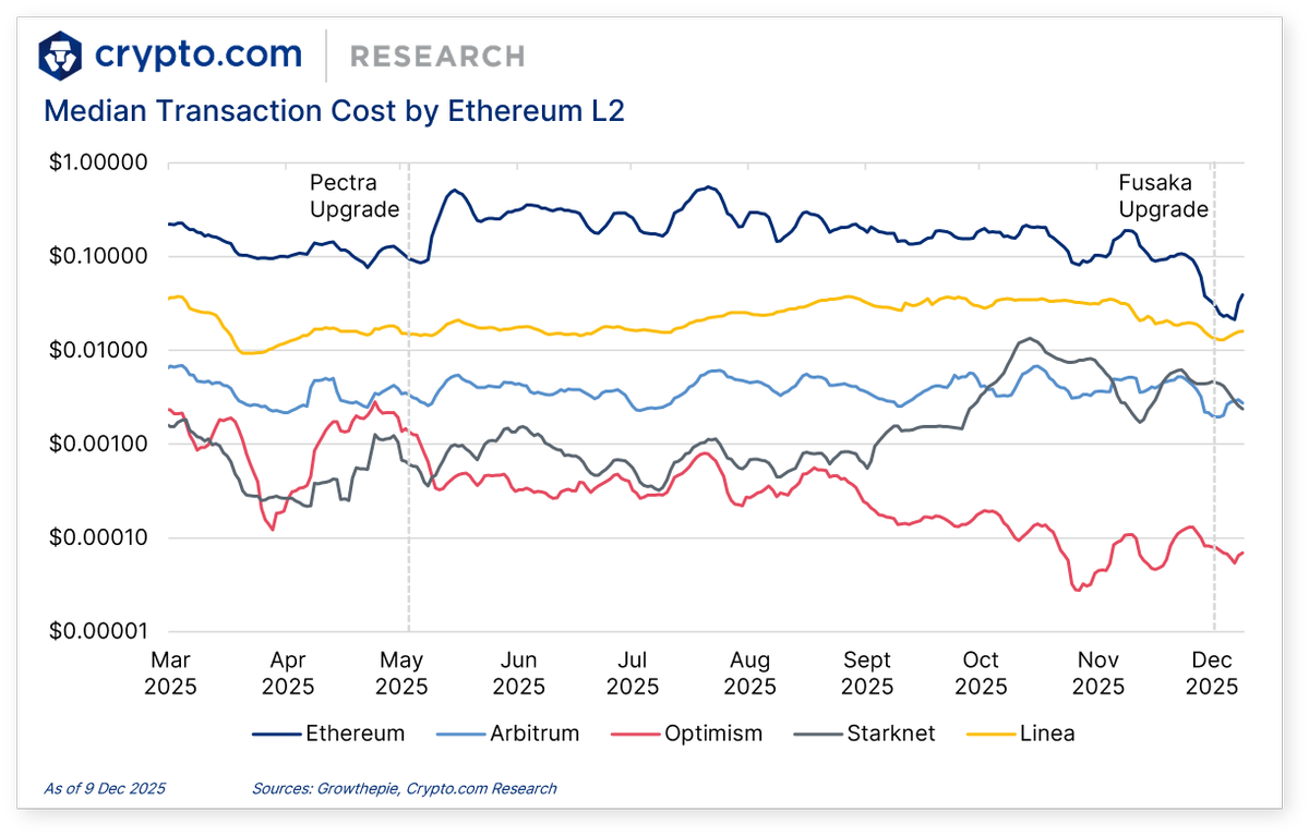 以太坊生态系统正步入另一个转型阶段,Crypto.com研究机构的最新数据显示,在Fusaka升级成功后,第二层网络交易成本出现了显著变化。与此同时,新的合作伙伴关系和基础设施发布正在重塑去中心化金融格局,预示着该行业更广泛的成熟化趋势。