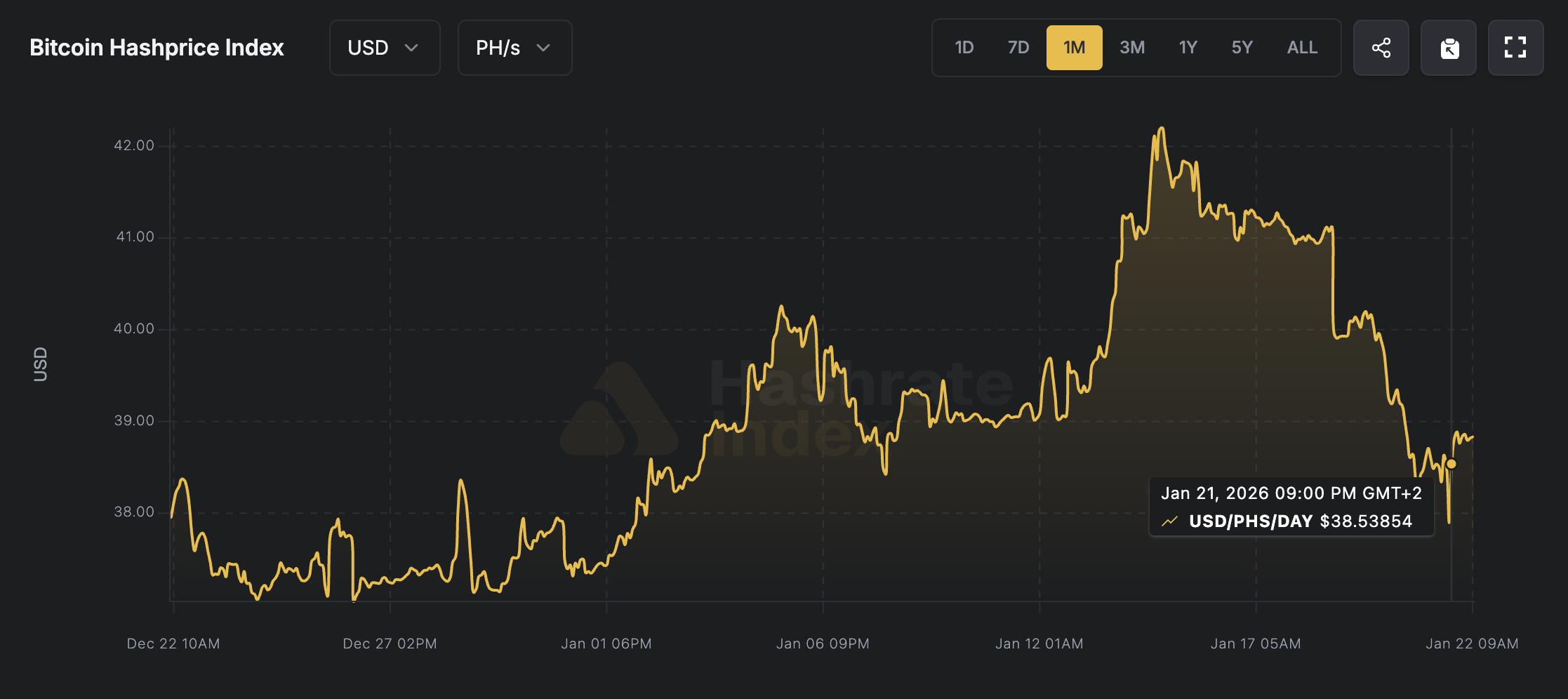 挖矿盈利能力同步下降,每PH/s日收益从41美元降至38美元,这与近期比特币价格回调密切相关。