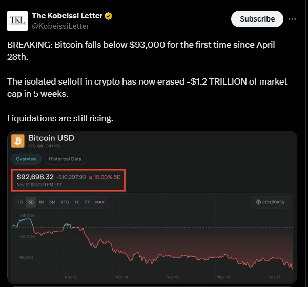 约五周时间内,加密货币总市值从十月初的历史高点暴跌逾1万亿美元。