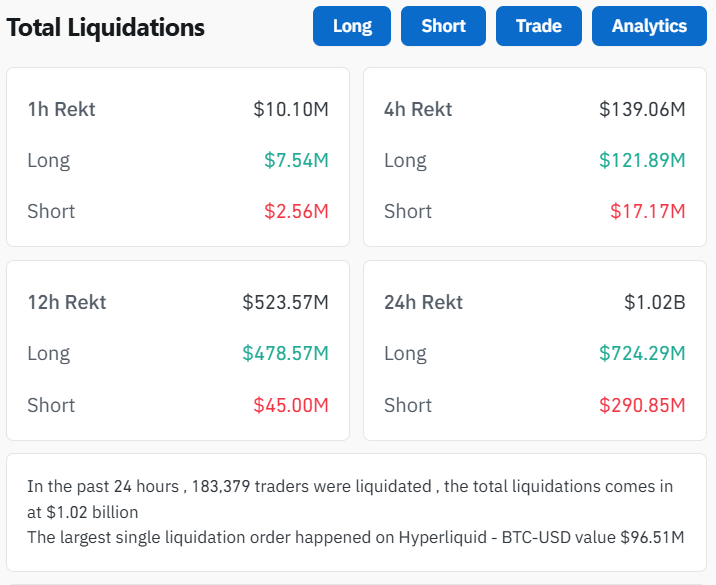 价格急跌引发连锁强制抛售。仅过去24小时,CoinGlass数据显示杠杆交易平台清算规模超10亿美元。
