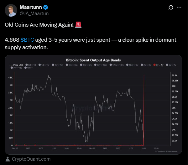 链上出现警示信号:约4,668枚BTC(价值4.4亿美元)在休眠3-5年后突然被转移。此类"远古代币"的异动通常预示长期持有者正在获利了结。本次涉及2020-2022年间未动用的比特币,表明持有者可能正在下跌中重新配置资产或锁定利润。