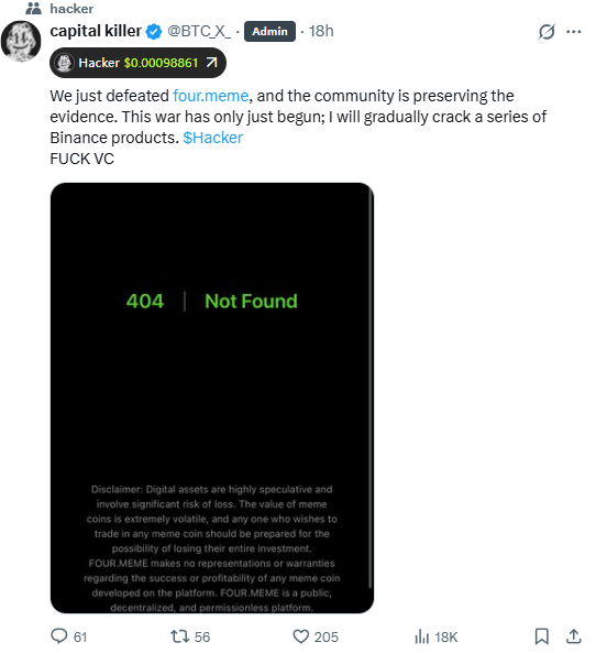 一个独立的社交信号进一步放大了事态。一个X平台账户发布消息声称:“今天我将对four.meme发起攻击。我将使用我新开发的病毒注入攻击……”