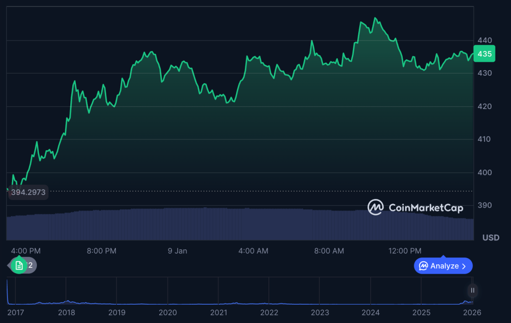 发布公告后,ZEC 价格从 400 美元下方小幅反弹至 435 美元。该代币虽较 2025 年近 700 美元的高点仍有下跌,但在注重隐私的用户群体中仍保有采用率。