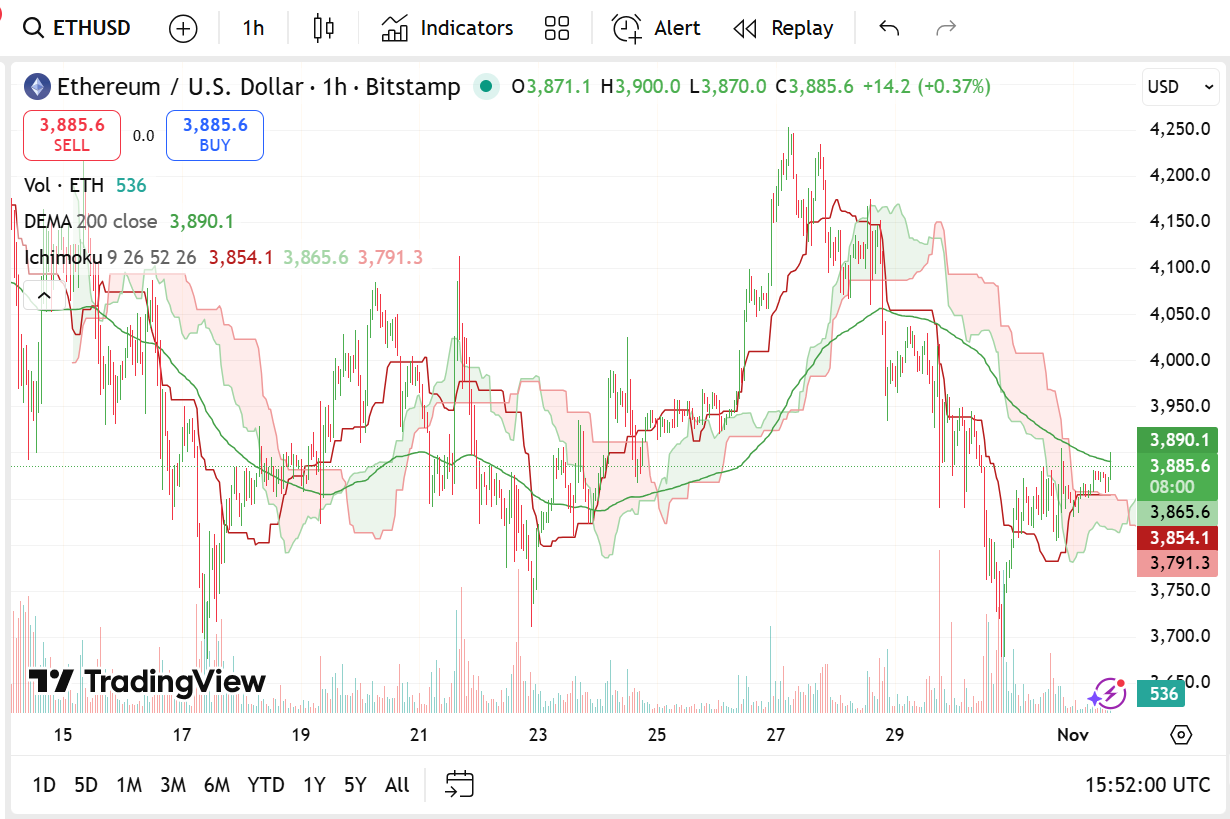 截至当前,以太坊交易价格约为3,884.82美元,日内跌幅0.41%,总市值达4,686.7亿美元,日交易量约241亿美元。尽管出现小幅回调,但在开发者参与度和DeFi采用率的支撑下,以太坊网络活跃度依然强劲。