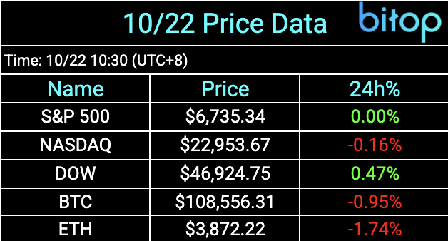 周二,在可口可乐和3M公司强劲财报的推动下,道琼斯工业平均指数创下历史新高。加密货币市场在过去24小时内下跌2.04%,比特币暴跌6000点回落至10.8万美元。以太坊基金会向一个被Arkham标记为曾用于抛售的钱包转移了16万枚ETH(约合6.54亿美元),执行董事王筱维澄清称这属于计划内的钱包迁移。
