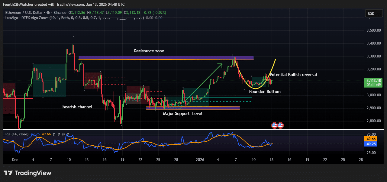 ETH/USD交易对在4小时图表上显示出潜在的看涨反转信号,其在关键支撑位附近形成了圆弧底形态。价格在近期触及3,300美元附近高点后回落,目前交易于3,120美元。价格走势表明卖压正在缓解,买家正逐步重获主导权,这可能预示着新一轮上涨行情的开端。