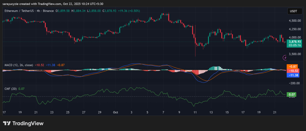 截至10月22日,该资产已录得0.48%的跌幅,日内高低点分别位于4109美元和3828美元附近。值得注意的是,若ETH能突破4200美元关键阈值,或将开启强劲上涨行情。当前以太坊报价约3849.30美元区间,市值达4660.7亿美元,日交易量暴涨31.73%至490.7亿美元。据Coinglass数据显示,市场在过去24小时内清算了价值1.6671亿美元的ETH头寸。