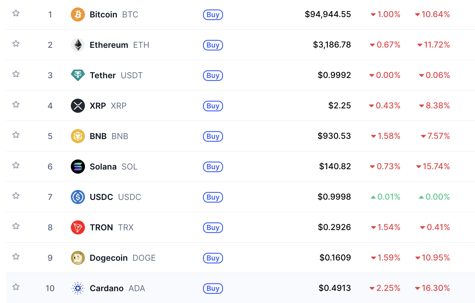 比特币下跌之际,主要山寨币遭遇大规模抛售。以太坊周跌12%至3,182美元,瑞波币跌至2.25美元。BNB报932美元,周跌幅近8%。Solana成为重灾区,周暴跌16.5%至140美元。狗狗币回落至0.161美元,卡尔达诺滑落至0.491美元,波场币相对稳定在0.292美元。