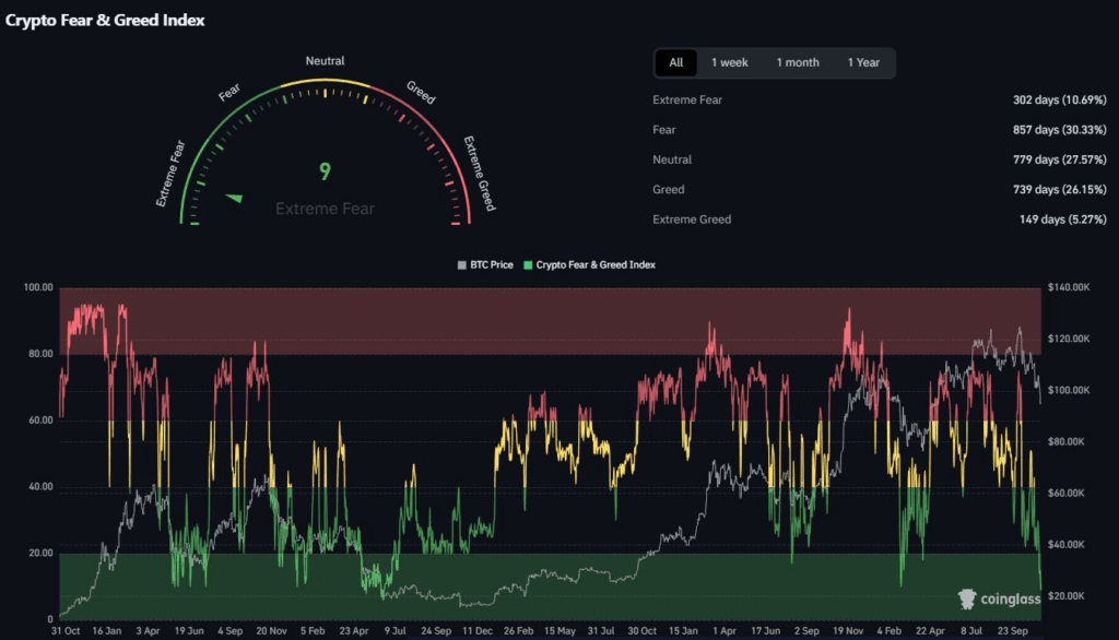 当前恐惧与贪婪指数跌至9/100的极端值,类似2022年比特币20000美元筑底时的读数。极端恐惧鲜少出现在熊市初期,而多出现于调整尾声。结合大幅下跌后的小幅反弹,市场已显现典型底部特征。