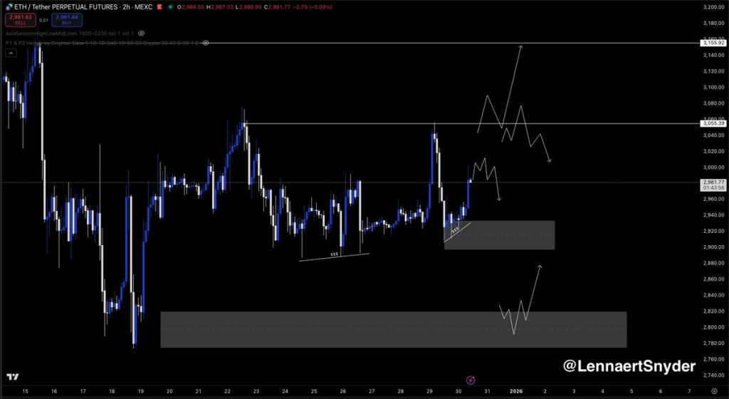 以太坊当前面临3055美元附近的阻力。据交易员Lennaert Snyder分析,若价格在此处未能走强或显现疲态,可能会出现做空机会。他指出:"如果价格从这里开始出现市场结构转变,或是先上冲再转势,我将考虑做空。"