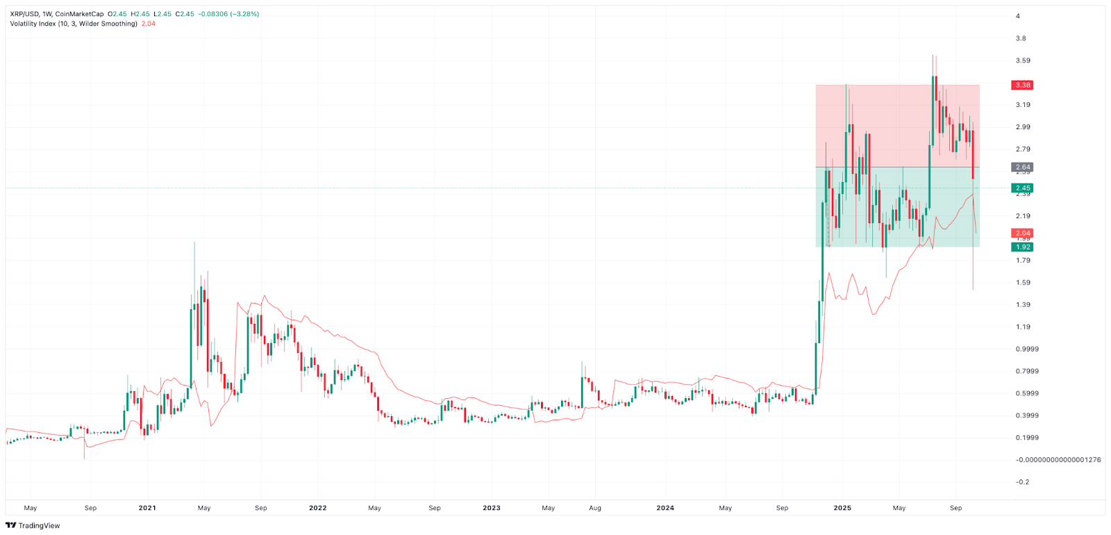 本周该代币单日暴跌16%至2.45美元,创下2024年初以来最陡峭的周线跌幅。更重要的是,这标志着XRP彻底跌破了维持数月的2.64-3.38美元震荡区间。周线图显示价格刺穿区间下沿,短期情绪转为看空,1.92美元成为下一个潜在支撑位。