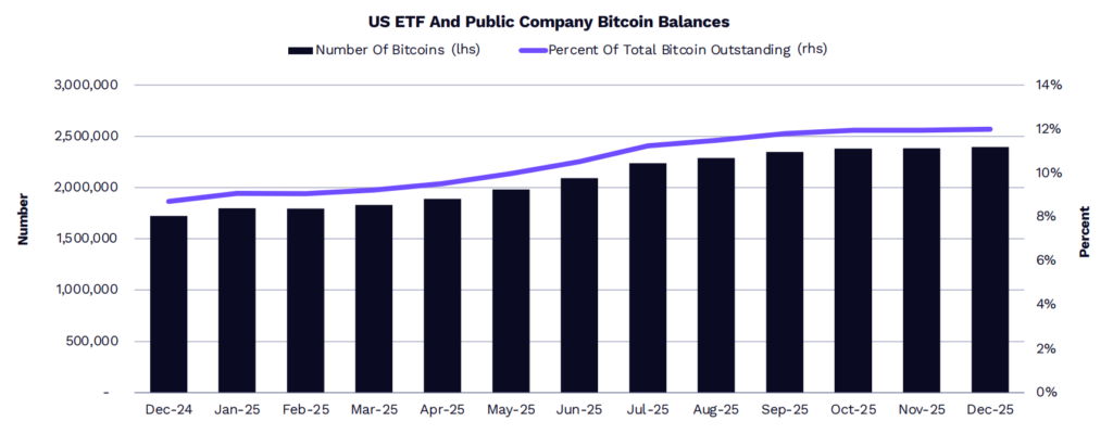 报告指出,美国上市的ETF和公司国库买家在2025年将其持有的总供应量占比从约8.7%提升至12%。