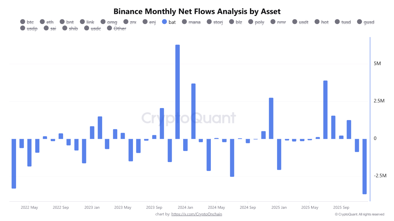 CryptoQuant数据显示币安12月BAT净流出达368万美元。这些提现代表代币从交易所转移到外部钱包。该数字标志着自2022年3月以来的最高月度流出量。此类动向通常表明持有者将资产转移至冷存储。