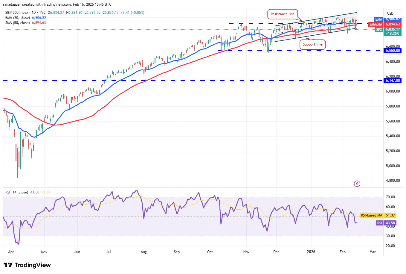 移动平均线即将形成死叉,相对强弱指数(RSI)处于负值区域,表明空头正在卷土重来。如果价格跌破6,780点,指数可能开始更深度的回调,目标位6,720点,然后是6,550点的强劲支撑。