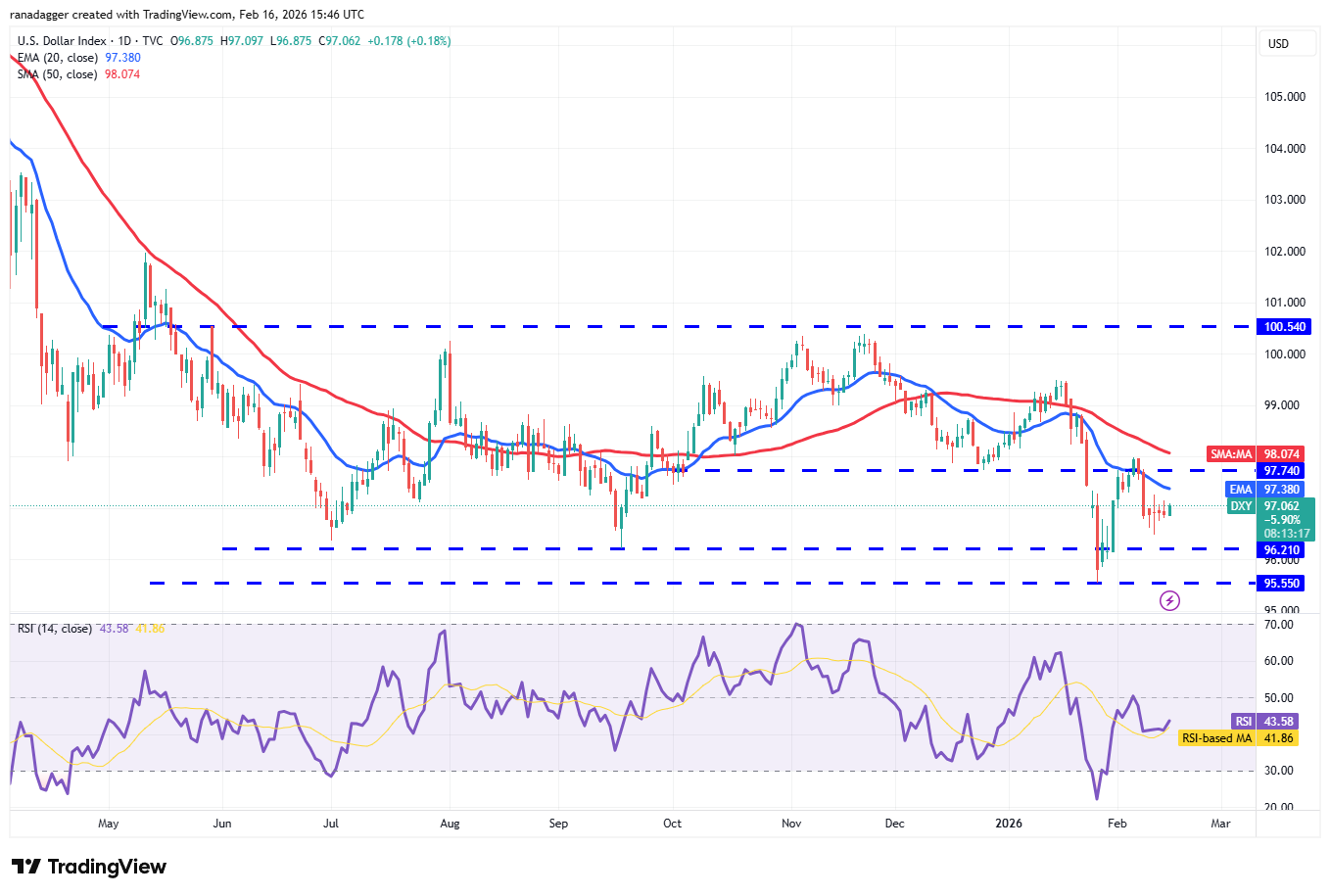 美元指数(DXY)一直在移动平均线下方交易,但空头未能成功挑战96.21至95.55的支撑区域。