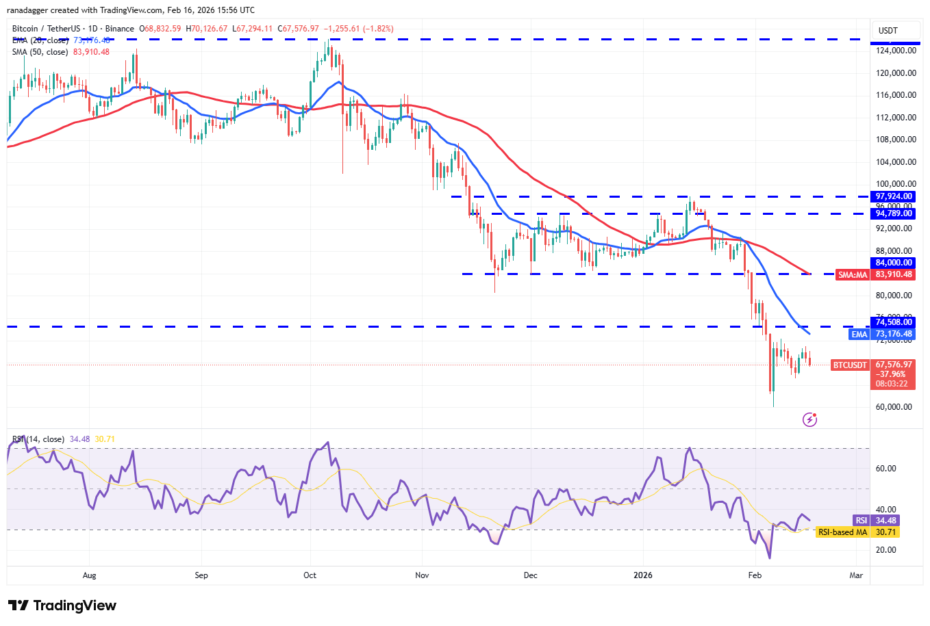 买家必须将比特币价格推升至74,508美元的破位水平之上,才能表明看跌势头正在减弱。随后,该交易对可能飙升至50日简单移动平均线(SMA)(83,910美元),预计空头将在该位置进行强力防御。