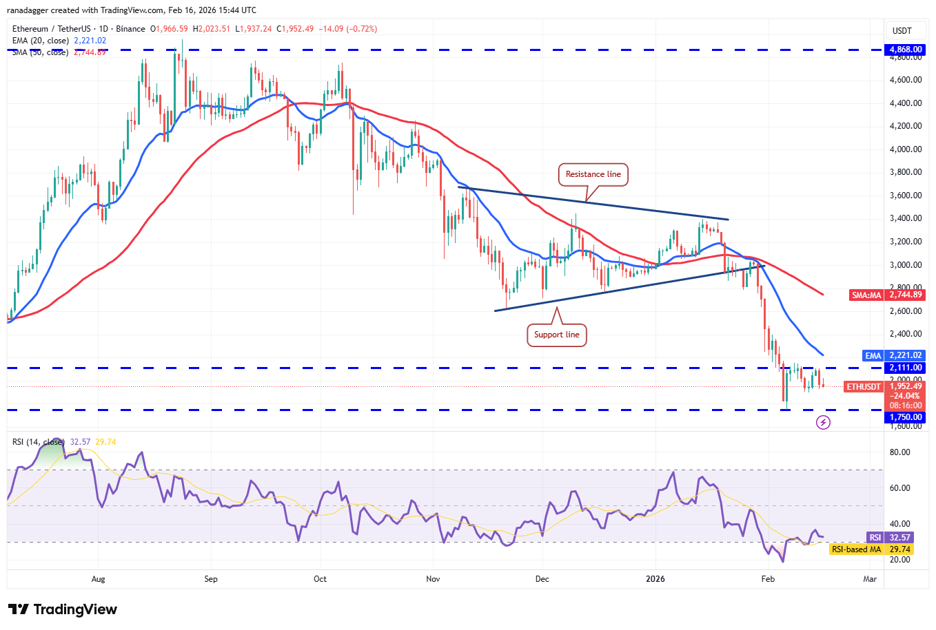 卖家将试图将价格拉低至即时支撑位1,897美元下方。如果成功,ETH/USDT交易对可能跌至1,750美元水平。预计买家会全力捍卫1,750美元水平,因为收盘价若低于此位,该交易对可能下探至1,537美元。