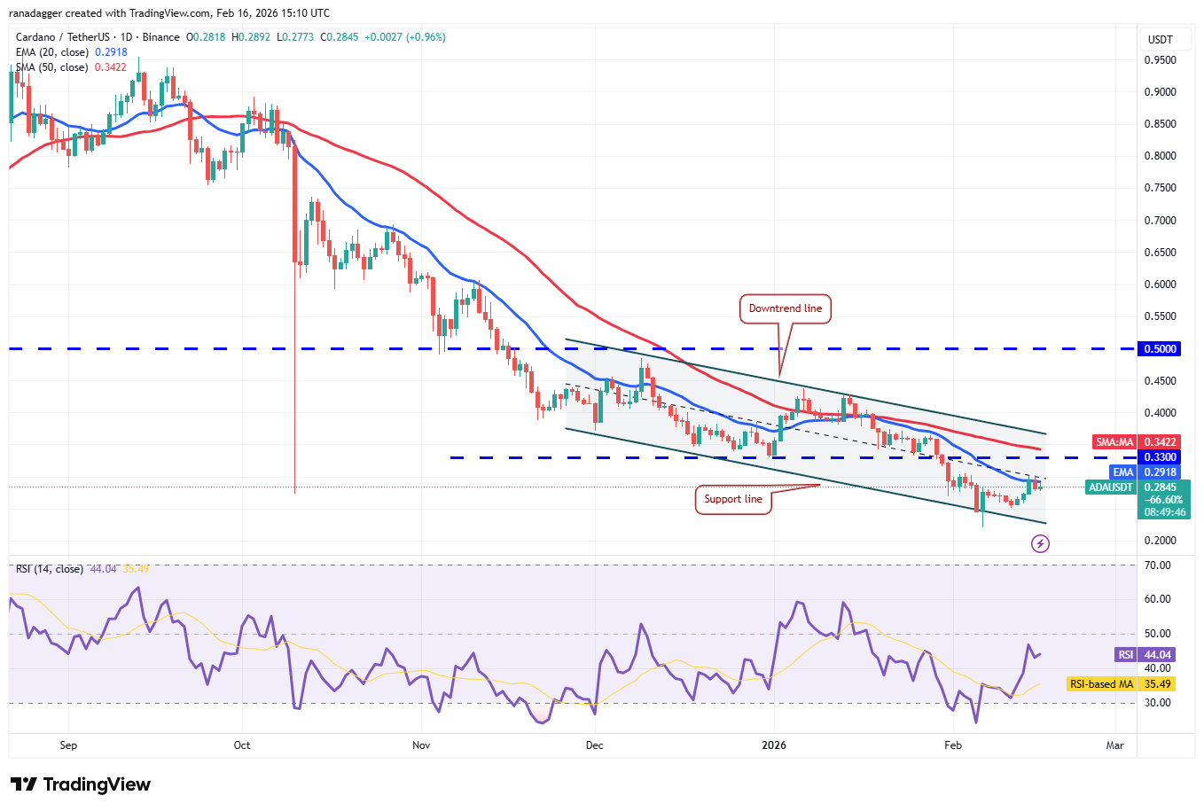 卖家需要将卡尔达诺价格拉低至支撑线下方,才能将下跌走势延伸至下一个支撑位0.20美元。