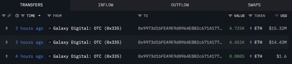 链上专家Lookonchain披露,疑似与Bitmine关联的新建钱包0x9973从Galaxy Digital接收了ETH。