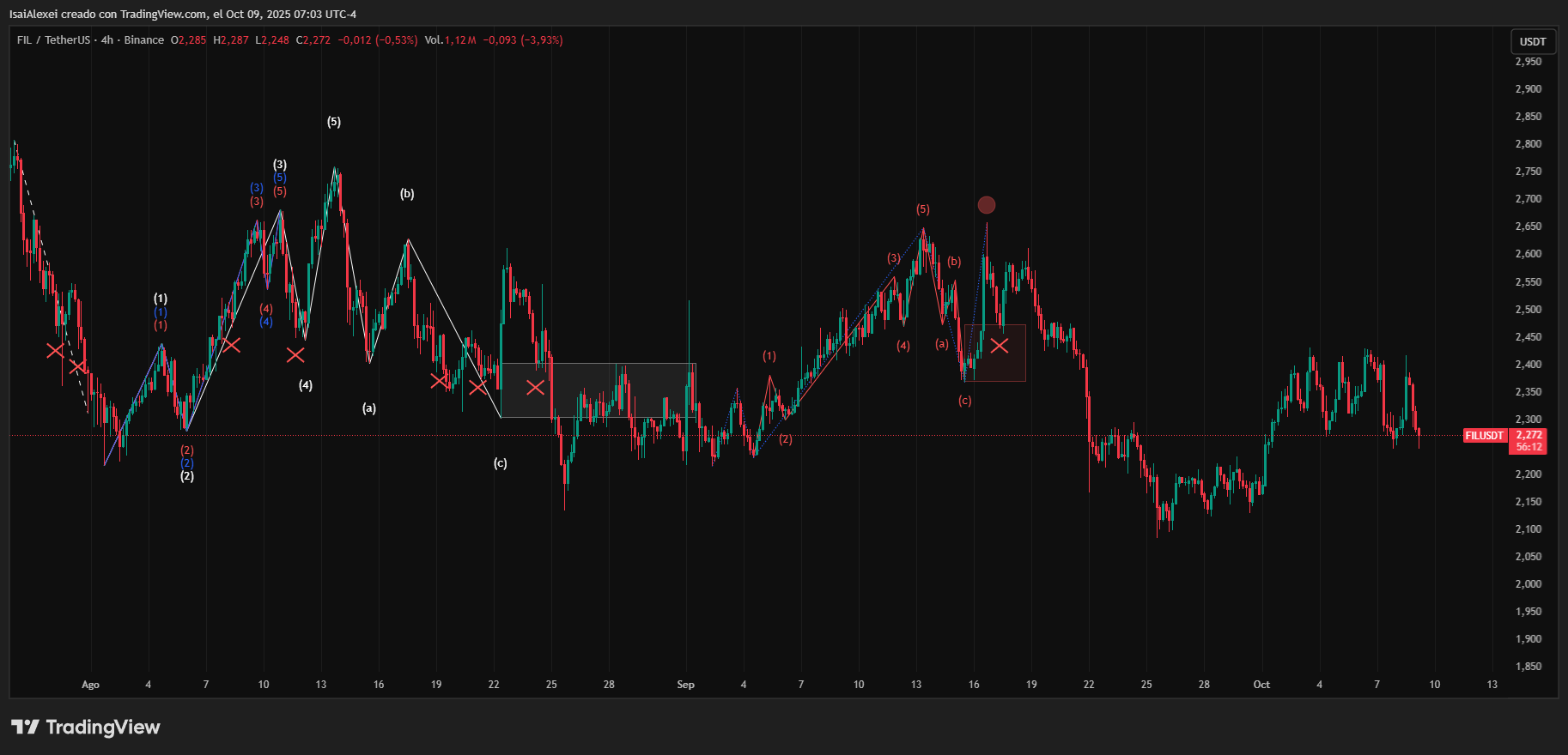 FIL持续在2.20-2.40美元区间震荡,9月下旬多次突破尝试未果。2.25美元区域构成短期支撑,而2.37-2.41美元仍是关键阻力集群。