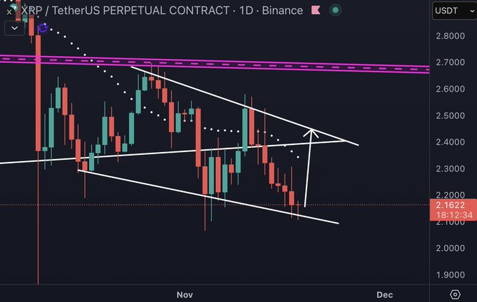 分析师Cryptoes(@cryptoes_ta)发布的日线图显示,XRP正在下降楔形通道内运行,该形态引发市场对反弹行情的关注。这一技术结构通过两条收敛趋势线引导着11月以来的价格走势:上轨持续构成阻力,而下轨则不断吸引买方介入。