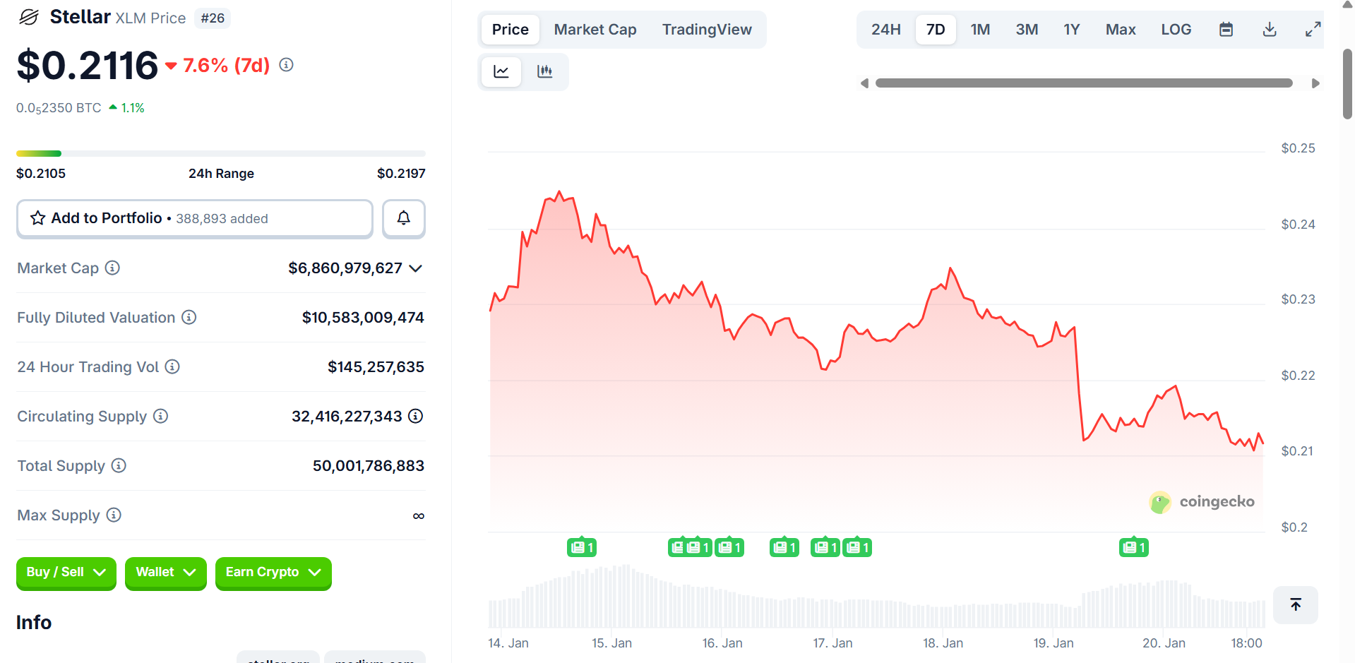 恒星币(XLM)交易价格在0.21至0.23美元区间,日交易量约1.43亿美元,市值接近68亿美元,使其稳居主要山寨币前列。在印度,XLM在2026年1月19日经历明显日跌幅后,报价接近19.83印度卢比。就XLM恒星币价格预测而言,当前区域看似一个稳固的基底,但交易者仍在等待能够改变势头的推力。
