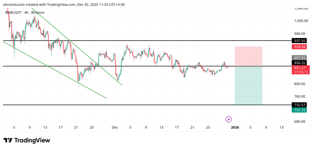 BNB持续在关键均线与水平位之间保持压缩状态。波动率低迷,动量平坦,价格遵循紧缩平衡区间。交易者正密切关注价格能否突破851.3美元以界定下一阶段走势。