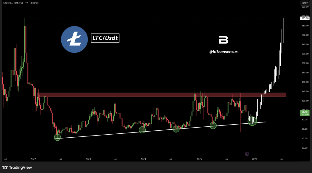 莱特币(LTC)当前牢牢守住关键支撑位,交易员正研判其下一步走势。尽管多次遭遇阻力回落,但该加密货币展现出韧性,从多年上升趋势线反弹。目前市场焦点集中在140美元阻力位,许多分析认为突破该位置可能触发LTC新一轮上涨动能。