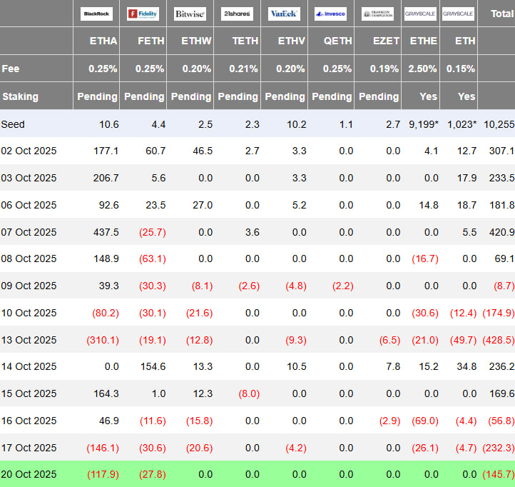 10月20日以太坊ETF净流出1.457亿美元,贝莱德和富达领衔